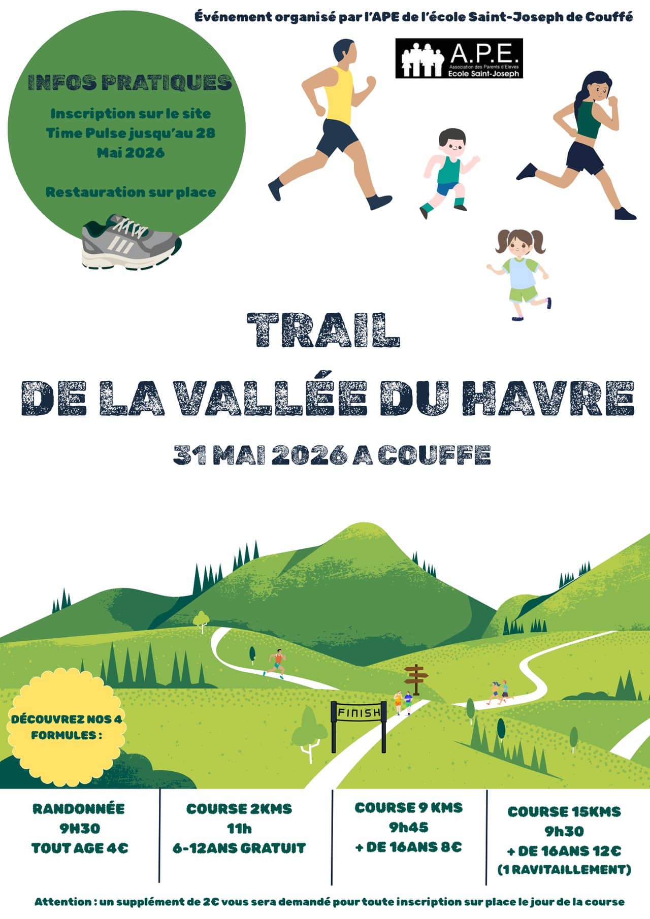 Le dimanche 31 mai 2026, l’Association des Parents d’Élèves de l’École Saint-Joseph de Couffé organise un Trail Nature familial « sans classement » ainsi qu’une randonnée pédestre pour tous les âges. Il s’agira de deux parcours de 9 km, et 15 km et d’une course pour les enfants de 2 km. La randonnée est libre et pourra s’effectuer sur le parcours du 9 ou 15 km selon ses préférences.