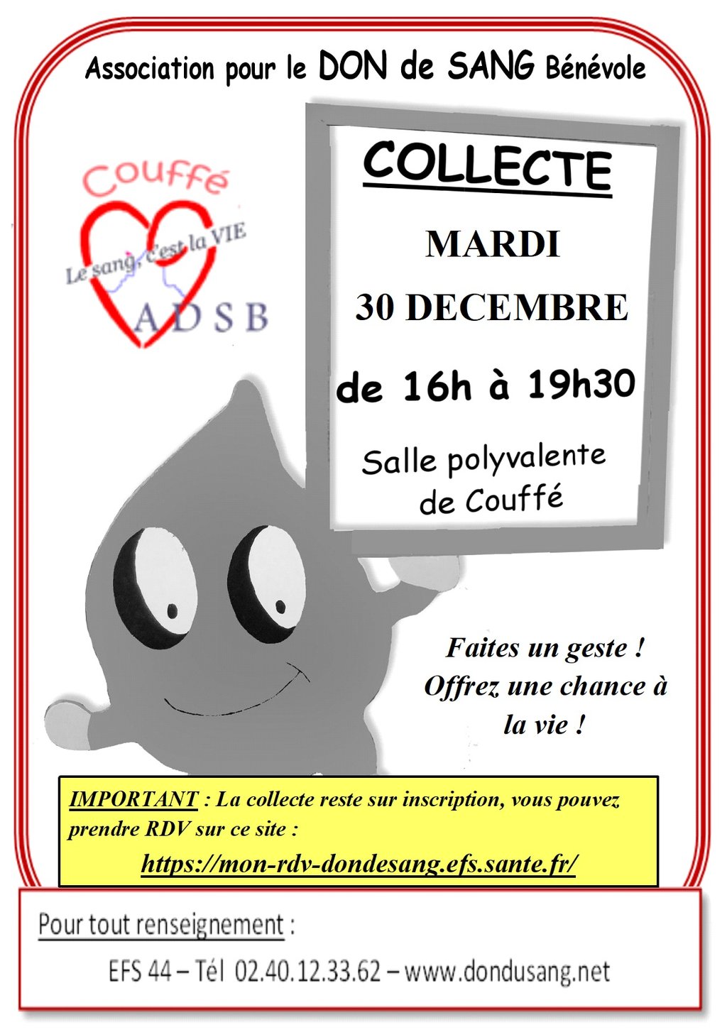 L'ADSB organise sa dernière collecte de l'année 2025.          Mardi 30 décembre à partir de 16 h          Salle polyvalenteMerci de prendre RDV à l'adresse suivante : https://mon-rdv-dondesang.efs.sante.fr/https://mon-rdv-dondesang.efs.sante.fr/L'ADSB vous souhaite de bonnes fêtes de fin d'année.Fichier joint : https://files.appli-intramuros.com/files/events/attachments/853/2025122823121518455_2025-12-30.pdfLiens : https://mon-rdv-dondesang.efs.sante.fr/