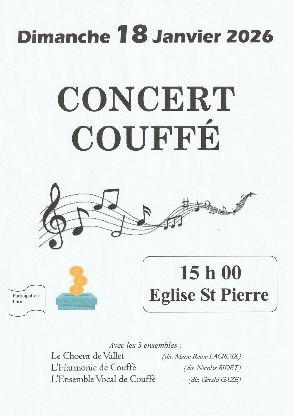 L'Ensemble Vocal de Couffé vous invite à venir découvrir les répertoires de  Le choeur de Vallet L'Harmonie de Couffé et L'Ensemble Vocal de Couffé Dimanche 18 janvier 2026 à l'église Saint-Pierre à partir de 15 h. Une après-midi 100% musique !🎵🎤participation libre